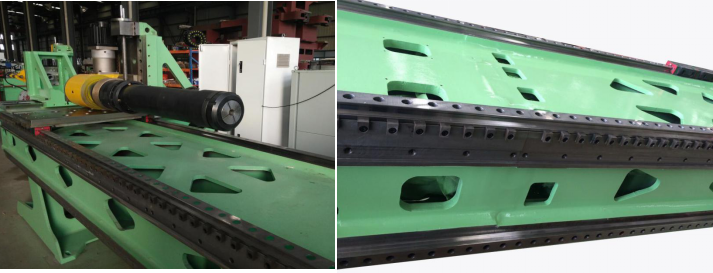 1、機(jī)頭和三道軌床身由高強(qiáng)度Q345或16Mn鋼板焊接而成,縱橫交錯(cuò)加強(qiáng)筋設(shè)計(jì)并經(jīng)退火消除內(nèi)應(yīng)力和拋丸處理。床身有足夠的強(qiáng)度和剛性,插芯彎管時(shí)無震動(dòng)現(xiàn)象,防永久變形也同時(shí)為三個(gè)90°分布的重載滾柱直線道軌提供高精度保持性基礎(chǔ)。整機(jī)由龍門加工中心整體加工,床身和機(jī)頭有極高的精度。