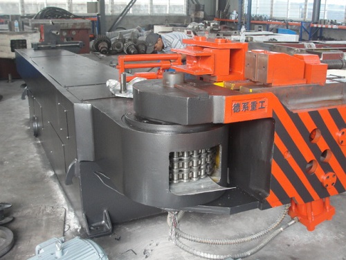 ● 傳動(dòng)主軸裝配時(shí)直接從機(jī)頭上部插入,安裝精準(zhǔn),維護(hù)方便。彎管主軸與傳動(dòng)鏈輪整體鑄造,整體加工,整體滾齒,無鍵連接,短節(jié)距滾子鏈傳動(dòng),受力均勻。傳動(dòng)主軸由雙油缸驅(qū)動(dòng),彎管3.1轉(zhuǎn)/分,彎管過程中,轉(zhuǎn)臂在接近彎曲設(shè)定的角度值前液壓系統(tǒng)自動(dòng)節(jié)流緩沖,極大的提高了彎曲精度。返回則達(dá)到4.2轉(zhuǎn)/分,快速復(fù)位,接近始點(diǎn)設(shè)有節(jié)流緩沖,極大的提高了復(fù)位精度和工作效率,同時(shí)利用復(fù)位背壓脹緊鏈條無需定時(shí)調(diào)節(jié)維護(hù)(是國內(nèi)少有采用該結(jié)構(gòu)的廠家)。