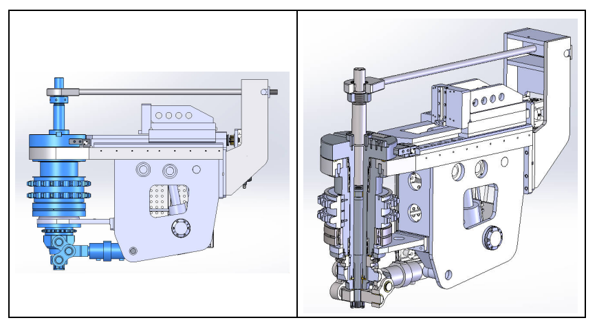 5.1.1. 彎曲臂箱體與彎曲主軸采用獨(dú)創(chuàng)的法蘭盤雙面貼合緊固安裝,為防止松動特采用銷軸和防松螺釘連接緊固并實(shí)時打表檢測安裝精度,定位緊固精度穩(wěn)定,傳遞力矩更大,傾覆剛度更高。箱體內(nèi)的滑動面均鑲嵌鋁錫青銅并定時潤滑,確保箱體無磨損。