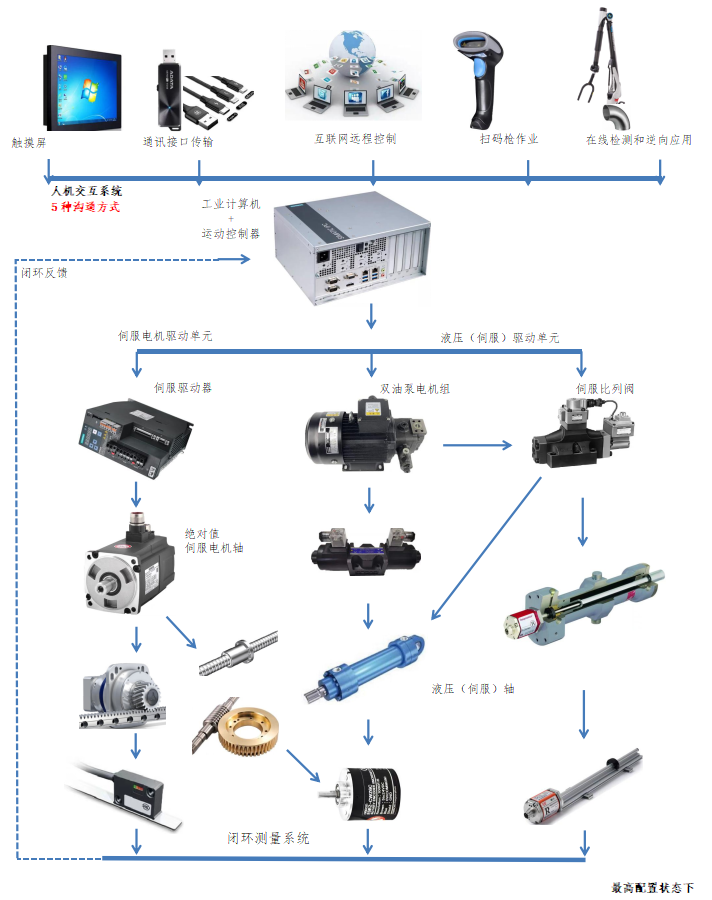 采用基于Windows10 操作系統(tǒng)的德國原裝進(jìn)口工業(yè)計(jì)算機(jī)為上位機(jī),通過多軸運(yùn)動控制器對整機(jī)各功能模塊、總成的軸系或工位實(shí)施極致性能的精確控制。該智能系統(tǒng)由人機(jī)交互系統(tǒng)(HMI)移動式操作界面(有啟動及急停按鈕),19寸投射式電容多點(diǎn)觸摸、LCD彩色觸摸屏、工業(yè)電腦(PC)和可編程多軸運(yùn)動控制器(Motion controller PLC)、絕對值伺服驅(qū)動單元(servo)及電器柜五部分組成。