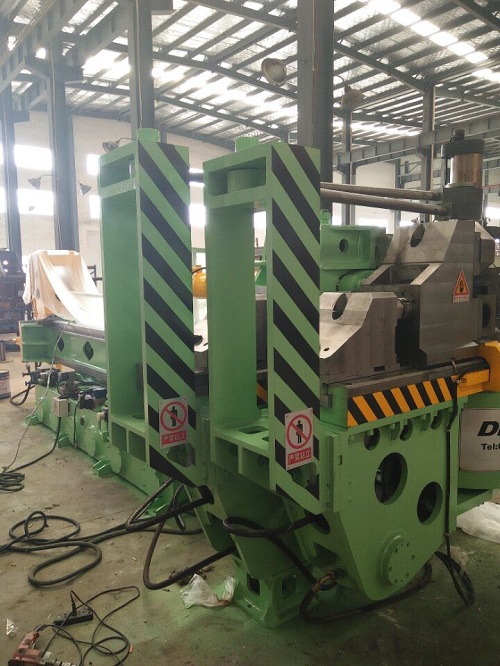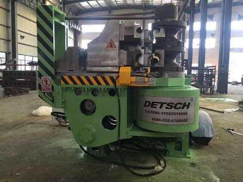 1、將管子(或型材)抱緊在頂鐓機(jī)構(gòu)(d)半圓槽(型腔)內(nèi)實(shí)現(xiàn)頂鐓工藝。2、為了避免管子(或型材)在彎制≥180度是可能產(chǎn)生的干涉,必須與壓料道軌模(c)動作高度一致。 |